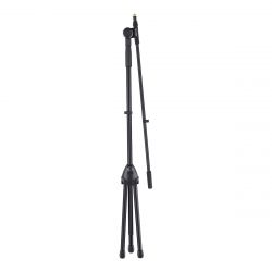 Tripié de piso para micrófono con brazo extensor (Boom) incluido. Su altura media es de 2,1 m, la máxima de 2,6 m y esta fabricado en metal de color negro.